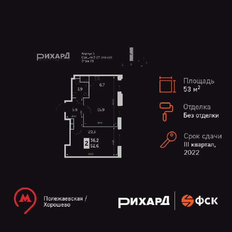 Продаётся 2-к квартира номер 413 общей площадью 53.5 кв.м. на 23-м этаже 27 этажного дома. Без отделки. Цена с учётом скидки!